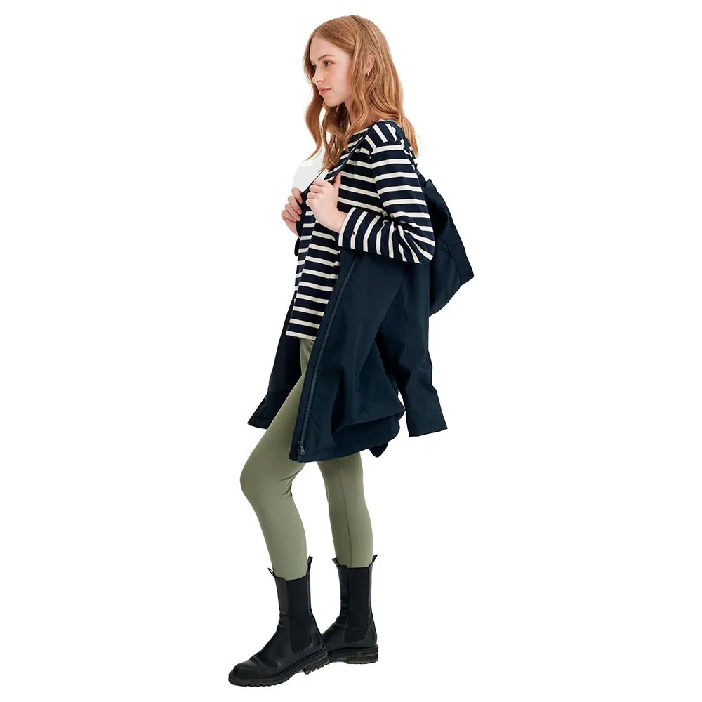 Bajo curvo más largo en la parte trasera central y cremallera de color azul marino contrastante y banda elástica con logo en la capucha.