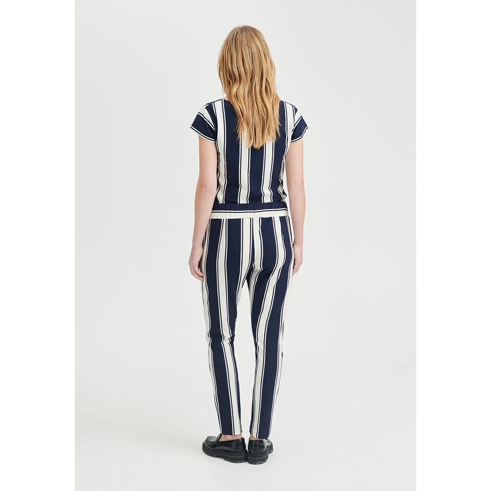 El patrón de rayas azul marino agrega un toque de sofisticación al aspecto general, lo que hace que estos pantalones sean adecuados tanto para ocasiones informales como semiformales. El tejido de alta calidad garantiza comodidad y durabilidad, lo que permite un uso duradero.