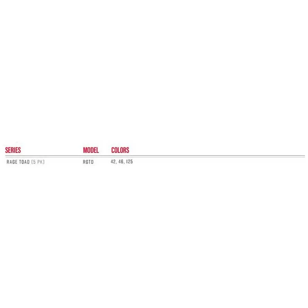 Desgarra el ´´toad rage´´ en la superficie del agua con el exclusivo plástico blando Strike King® Rage Tail® Toad equipado con patas únicas diseñadas para agitar más turbulencias de superficie que nunca. Para obtener los mejores resultados, coloque un aparejo ingrávido con los ojos en alto en un anzuelo de brecha ancha de 4/0 o 6/0 y pesque en la parte superior para una acción imbatible sobre el agua.