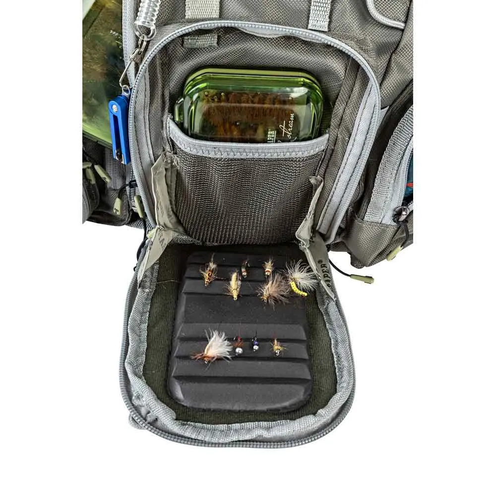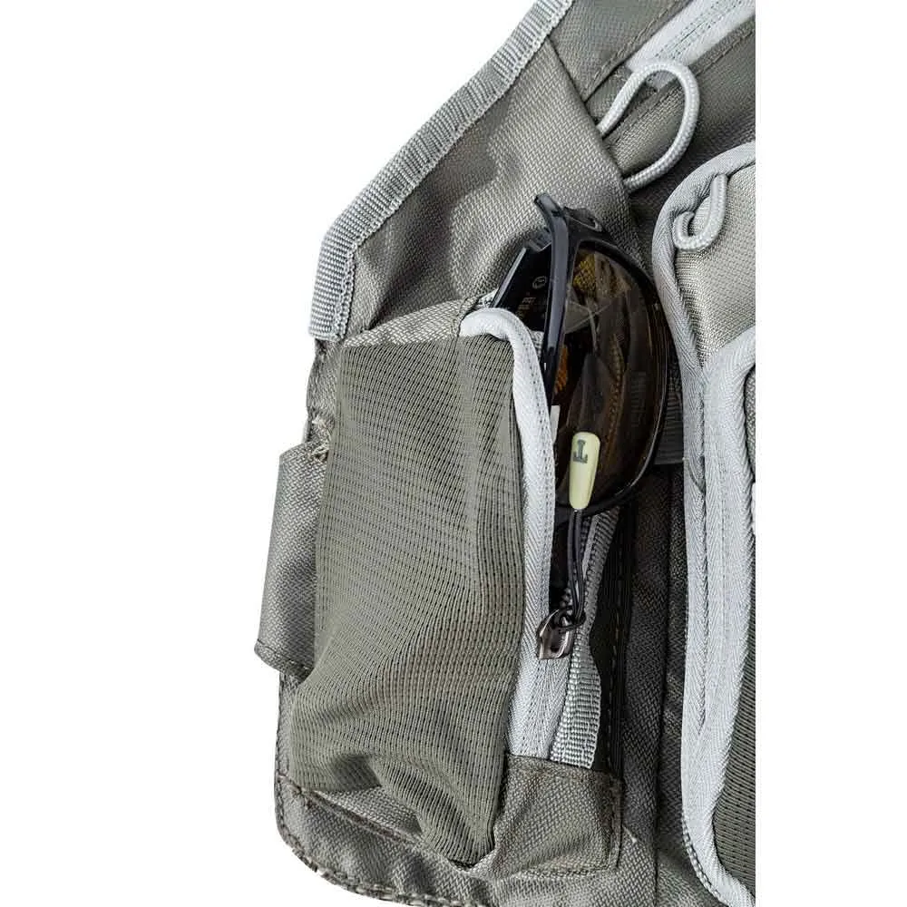 La principal ventaja del chaleco es que se puede adaptar a la altura y peso del pescador. Gracias a las correas de ajuste colocadas en los brazos y en los lados. Muchos bolsillos permiten empacar todos los accesorios necesarios durante la pesca. Los bolsillos con cremallera se utilizan para guardar señuelos y cajas de accesorios. Los más pequeños son ideales para guardar la línea de líder. En la parte delantera hay retractores cubiertos para accesorios. Los bucles se colocan en diferentes lugares del chaleco y permiten llevar artículos que se sujetan con ganchos de clip y zingers. En la parte superior hay Velcro para llevar una caña de repuesto desplegada. El cuello está terminado con neopreno suave debajo del cual se coloca el soporte de la red de aterrizaje. En la espalda hay un bolsillo grande para guardar la blusa o la chaqueta. Está terminado con una red de circulación en el interior. Después de desabrochar en los hombros y en los lados es posible montar la mochila Combo Active en la parte delantera del chaleco.