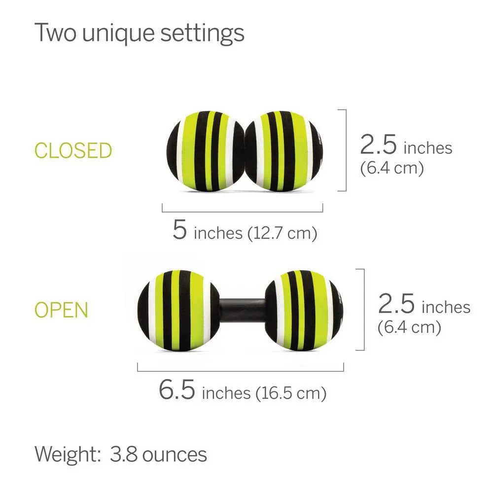 El rodillo MB2 utiliza dos bolas de masaje, extendidas por una longitud ajustable que forma el modo abierto; la longitud se bloquea de nuevo en las bolas que forman el modo cerrado.