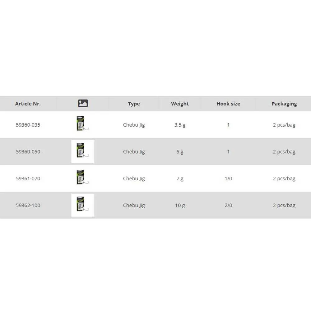 - El tipo Wizard Chebu Jig contiene un producto completamente único en cuanto a peso y forma, que también es perfecto para terrenos accidentados gracias al anzuelo extra.