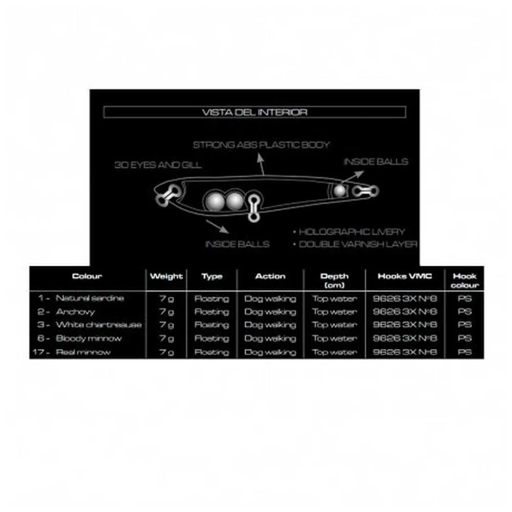 Tämä pieni Walker, kuten hänen vanhempi veljensä ZIG WALKER, navigoi määrätietoisesti ja repii veden pintaa selkeällä siksak-liikkeellä. Se on erittäin helppokäyttöinen ja se on tarkoitettu kalastukseen pääasiassa suistoissa, laguuneissa tai matalissa vesissä, joissa muita lajeja esiintyy tavanomaisten petoeläinten rinnalla, etsimään pientä ja edullista puremaa lähistölle.