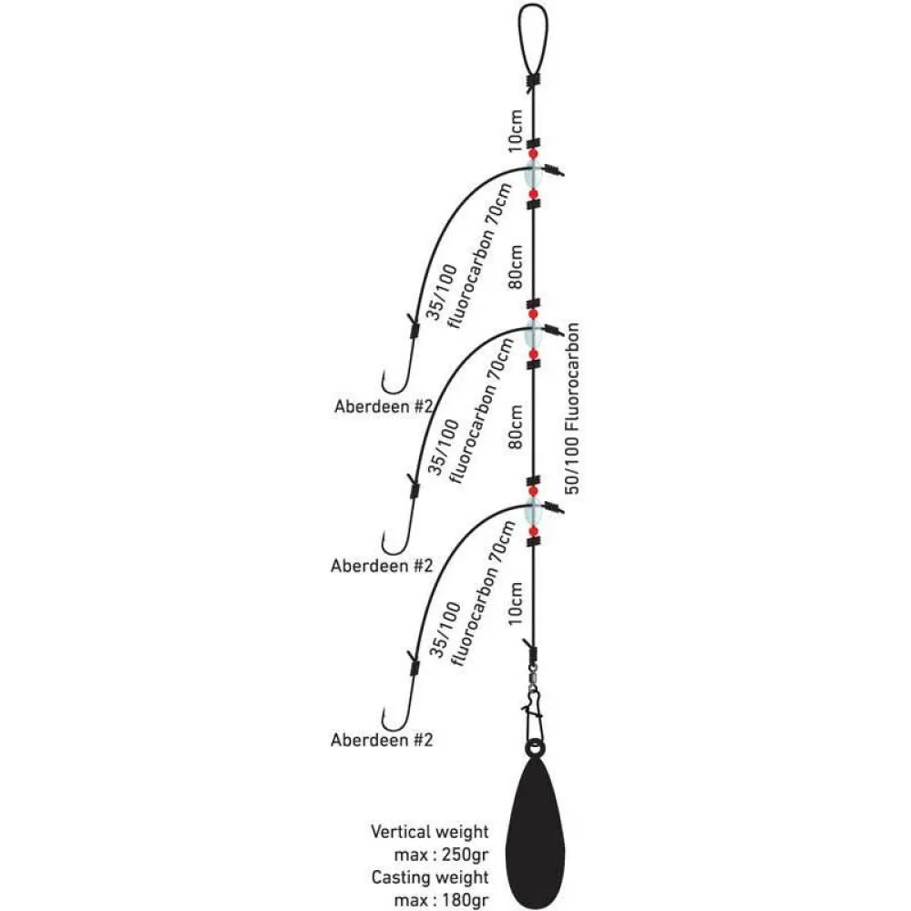 Tämä peruke on valmistettu DAIWA-brändille ominaisella tinkimättömällä laadulla ja innovaatiolla, ja se on suunniteltu suorituskykyiseksi. Tämän kokoonpanon ydin on korkean suorituskyvyn fluorocarbon-peruke, jossa on 3 haaraa ja terävät, luotettavat koon 2 koukut. Tämä kolmen koukun "paternoster"-tyyli on todistettu kalansieppaaja, jonka avulla voit esitellä useita syöttejä eri syvyyksissä vesipatsaassa, mikä lisää dramaattisesti iskun mahdollisuuksia. Fluorocarbon-materiaalin lähes näkymättömyys veden alla antaa sinulle kriittisen edun varmistaen, että varovaisimmatkin kalat keskittyvät syöttiisi, eivät siimaasi.