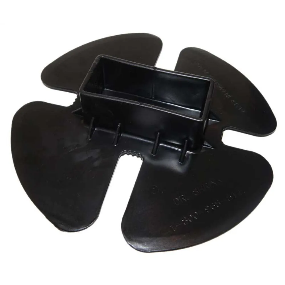 Musta PVC-kiinnike, jossa on 50 x 100 mm:n kokoinen kiinnitys. Se suojaa kangasta, kun siihen työnnetään tukitankojen tuki, jotta vesi ei pääse seisomaan. Neljä aukkoa mahdollistavat kiinnityshihnan kulkemisen veneessä. Voidaan käyttää myös tukitangon pohjana.