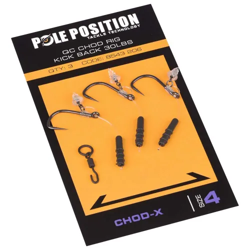 Tämä ainutlaatuinen QC Chod Rig voidaan vaihtaa nopeasti QC Chod Sleeve ja Swivel -lisävarusteiden avulla, jos uusi koukku on tarpeen. Rig on valmistettu Kick Back -rigimateriaalista ja yhdistetty terävään Pole Position Chod-X -koukkuun ja syöttiruuviin, jotta voit luoda täydellisen pop-up-esittelyn nopeasti. Se soveltuu tilanteisiin, joissa järvessä on levää ja liejua.