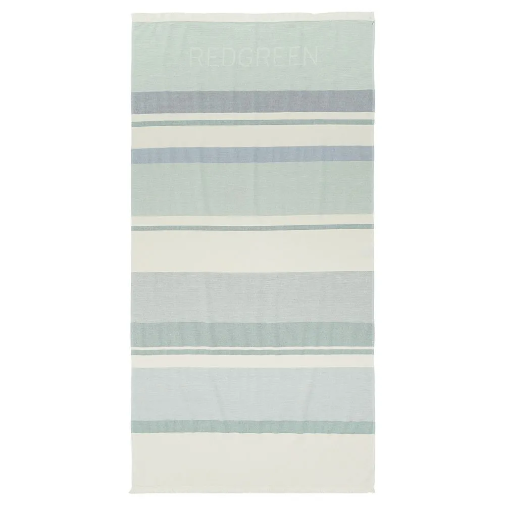 Raitainen, yksipuolinen kosteuspyyhkeen laadusta valmistettu ranta-pyyhe, jossa on jaquard-punavihreä logo.