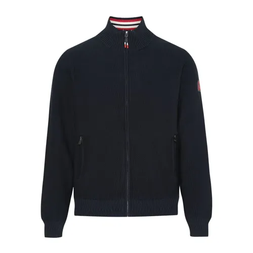 Täysi vetoketjullinen tuulitakki neulotusta helmi-neuleesta kontrastivärisillä raidoilla kauluksessa.