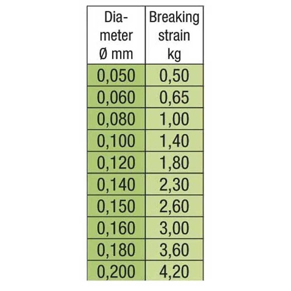 Optimoitu vetolujuus: Hyödynnä hienosäädettyä tasapainoa halkaisijan ja kantokyvyn välillä. Jokainen koko on suunniteltu tarjoamaan korkein mahdollinen vetolujuus annetulle halkaisijalle, mikä antaa sinulle tehokkaan ja luotettavan yhteyden saaliiseesi.