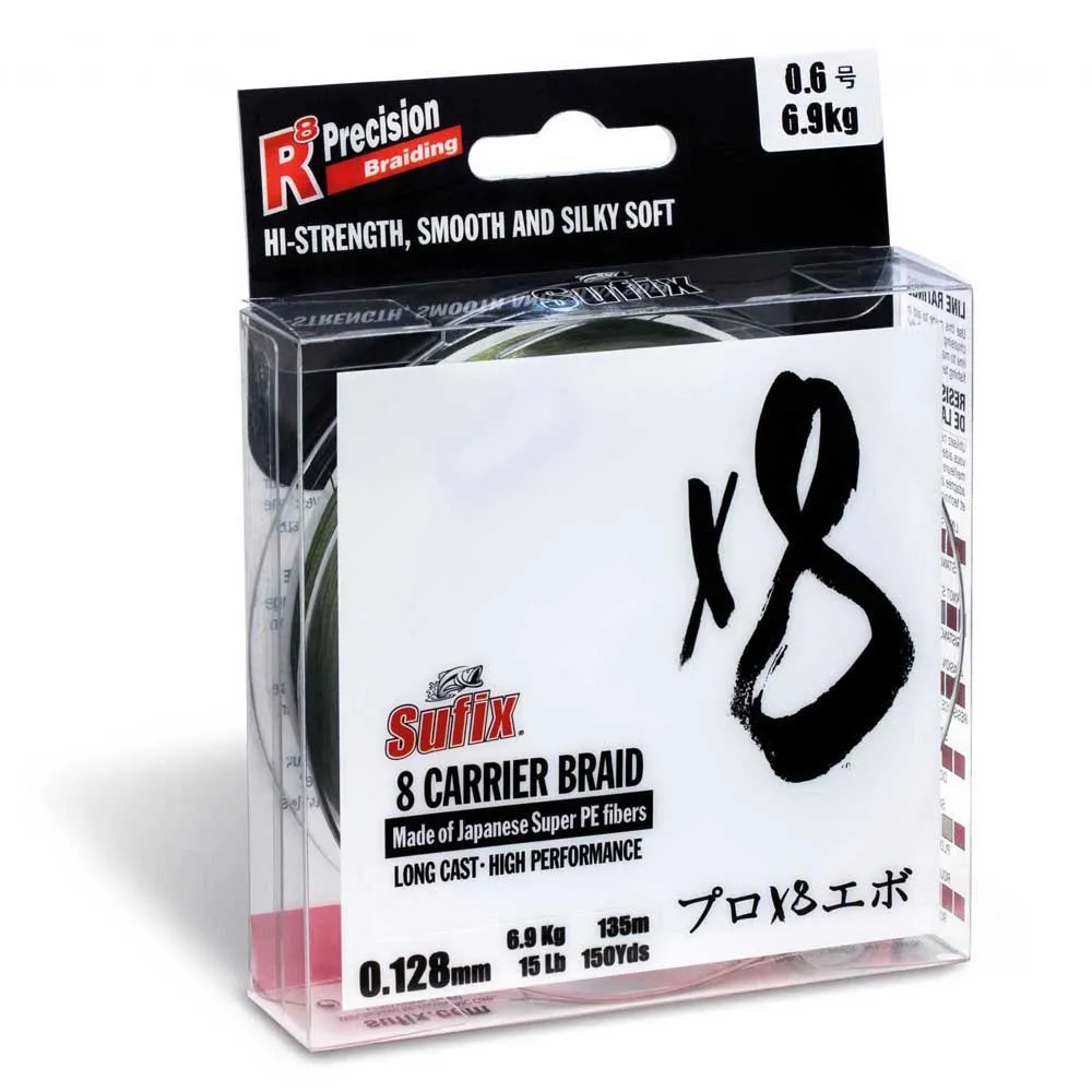 Sufix x8 on pyöreä, helppokäyttöinen ja silkinsileä japanilaistyylinen punottu siima. Sen 8-kanavainen rakenne ohuista HMPE-kuiduista tekee siitä erittäin vahvan ja ohuen siiman, jolla on korkea kulutuskestävyys ja erinomainen solmu- ja iskunkesto. R8 Precision Braiding -teknologia ja sen korkeajännitteinen punomisprosessi antavat tälle siimalle sen ominaisen pehmeän ja sileän laadun, jolla on tasainen halkaisija ja laatu sekä erinomainen lujuus-halkaisija-suhde. Materiaalit ja rakenne tarkoittavat, että siimalla on pieni kitka kulkiessaan vavan ohjainrenkaiden läpi. Tämä johtaa hiljaiseen toimintaan ja pitkiin, tarkkoihin heittoihin. Sufix x8 on suunniteltu sekä heitto- että pyöriväkelaille. Se on erinomainen vaihtoehto pienemmille vieheille, kevyille pehmeille muoveille (jiggaus), ahvenille, taimenille, kirjolohelle ja finesse-kalastukseen.
