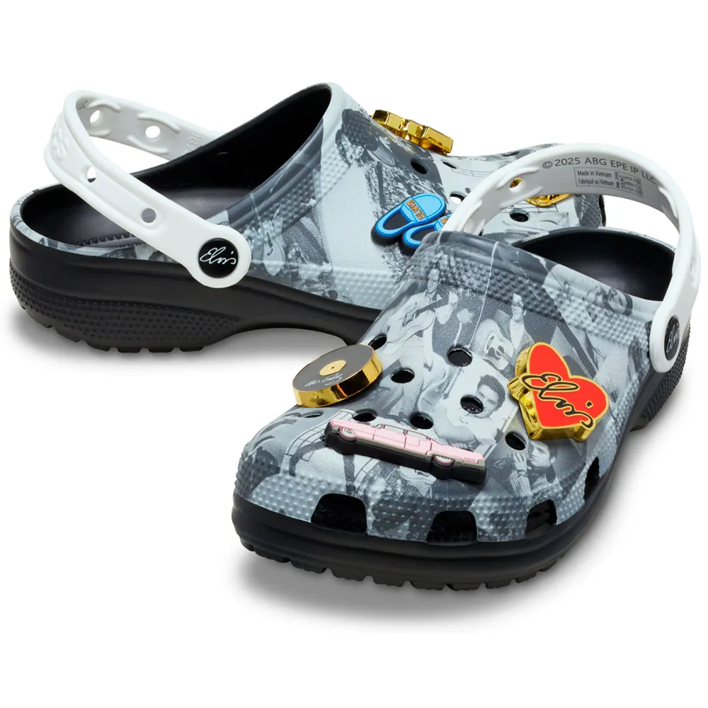 Merci, merci beaucoup. Dédié à l´un des plus grands, le sabot Elvis Classic est un hommage à Elvis, à sa présence vibrante et à son héritage qui perdure encore aujourd´hui. Chaque paire présente une collection de clichés en noir et blanc de sa vie et de sa carrière, ainsi qu´une collection de breloques Jibbitz™ colorées en émail qui leur donnent vie. Sur la semelle intérieure, on peut lire une citation sincère que vous pouvez emporter avec vous à chaque pas.