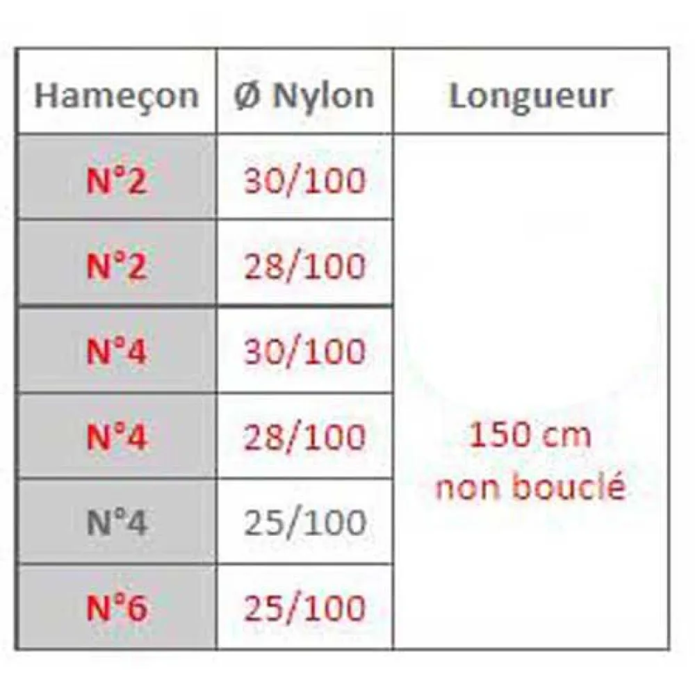 Crochets très robustes déjà montés sur nylon non bouclé (150 cm). Forme spécialement étudiée pour accueillir bibi. La palette facilitera l'accrochage du fascinateur avec une aiguille. Idéal comme stringer ou stack pour votre gréement ou surfcasting.