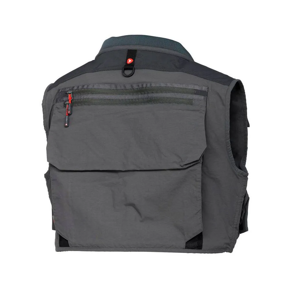 Il y a un rétracteur caché sur le gilet pour les coupe-lignes, une grande poche arrière double pour les articles plus volumineux et une doublure intérieure en maille très respirante qui laisse entrer l´air les jours de pêche plus chauds.