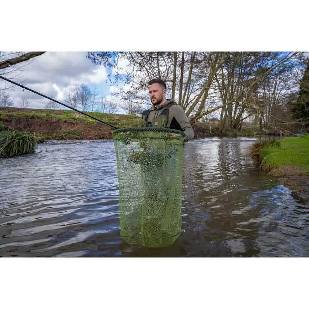 Spécialement conçu pour la pêche à la ligne en eaux vives. Doté d´une maille en caoutchouc latex respectueuse des poissons et d´un cadre en EVA ultra-flottant. Il y a un aimant intégré dans la poignée en liège dur, avec un cordon de sécurité en caoutchouc extensible. Cela garantit que si vous laissez tomber votre épuisette en marchant dans l´eau, elle ne s´éloignera pas en aval. Taille de la tête de l´épuisette 26´´/66cm. Taille du manche 30cm. Profondeur de la maille 60cm pour une rétention facile du poisson.