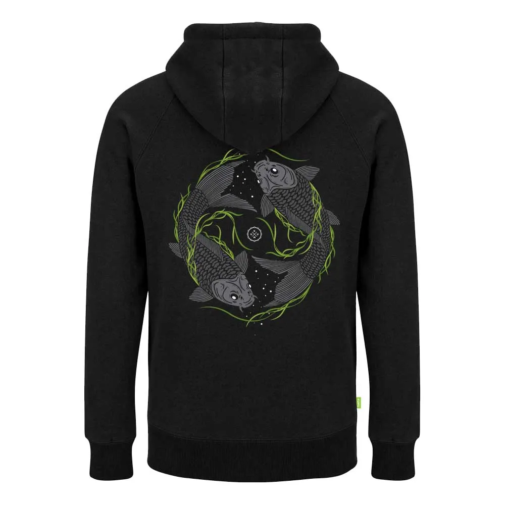 Dessiné à la main de A à Z, notre graphique Vortex représente deux carpes tournant à l´unisson à travers des herbiers. Sérigraphie en 5 couleurs composée de gris discrets avec un vert contrastant sur notre tissu brossé ultra doux et luxueux de 320 g avec des extrémités de cordon trempées de couleur assortie.