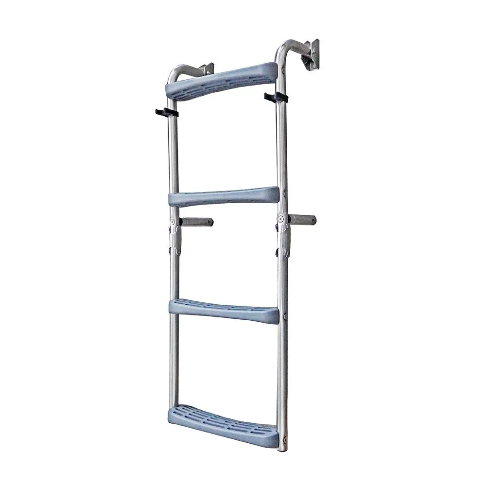 La caractéristique la plus remarquable de cette échelle est son mécanisme de pliage astucieux et sa configuration de marches polyvalente. Elle comprend 3 marches supérieures fixes et 2 marches inférieures mobiles qui peuvent être déployées, offrant une portée profonde dans l´eau pour un embarquement sans effort depuis une position de nage. Lorsqu´elle n´est pas utilisée, la conception innovante du crochet à 180° permet à l´échelle de se replier complètement à plat contre le tableau arrière. Cette solution de rangement compacte est idéale pour les bateaux où l´espace sur le pont est limité, gardant votre tableau arrière dégagé et sans obstruction en navigation. La combinaison de marches fixes et mobiles offre l´équilibre parfait entre une longue longueur utilisable une fois déployée et un encombrement minimal une fois rangée Spécifications techniques :