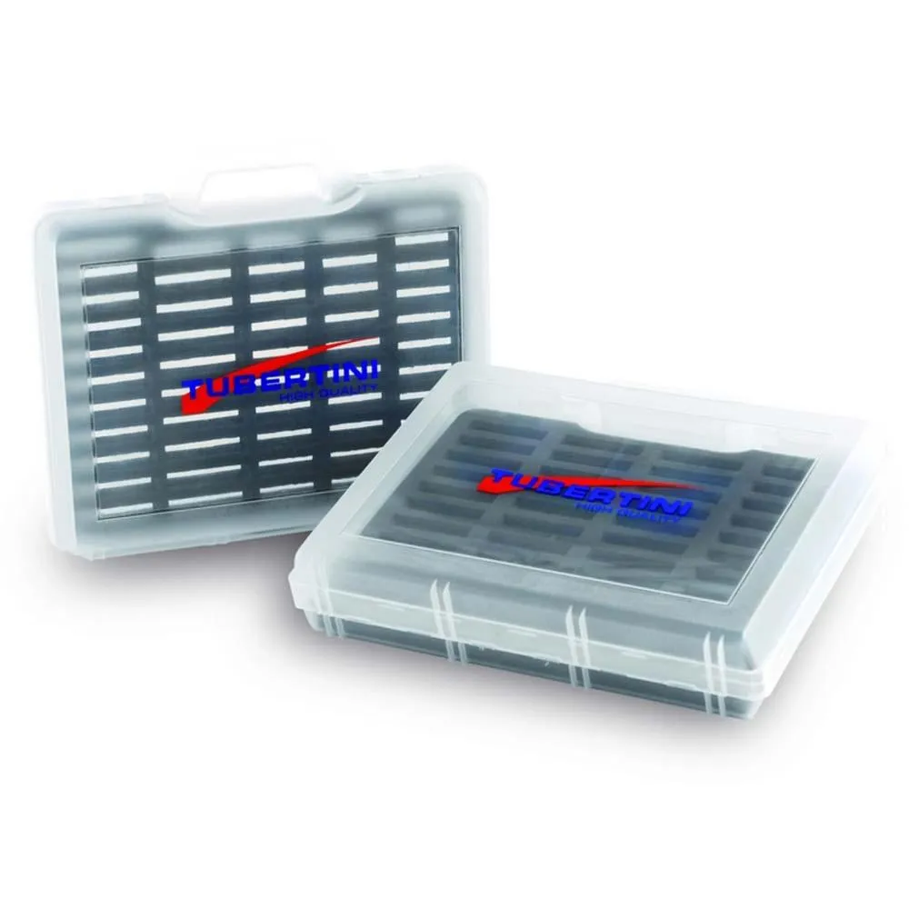 Boîtier en plastique pour des lignes autoplombées avec néoprène division. L´affaire 80110 ** avec 52 compartiments (il peut loger 31 disques? EVA Plate? Diamètre de 50 mm et 21 de diamètre 70 mm). L´affaire 80111 ** avec 44 compartiments (il peut loger 31 disques? EVA Plate? Diamètre 70 mm).