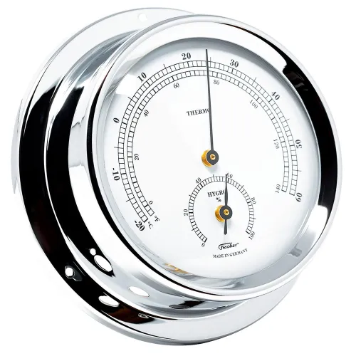 Proteggi il tuo clima interno con il FISCHER Range 100, un capolavoro dell´ingegneria tedesca. Questo squisito termometro e igrometro offre letture precise e immediate di temperatura e umidità su un classico quadrante da 100 mm. Il suo funzionamento meccanico senza batterie garantisce un´affidabilità perpetua. Meticolosamente realizzato in Germania, ti aiuta a mantenere un ambiente sano e a proteggere gli oggetti di valore dall´umidità impropria. Disponibile in ottone lucido o cromo, questo elegante strumento è un simbolo intramontabile di qualità e di artigianato sostenibile e senza manutenzione