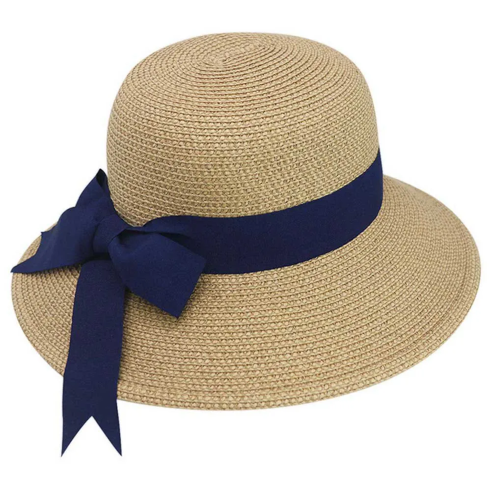 Questo modello ha un nastro marino rifinito a fiocco che lo rende estremamente femminile ed elegante.