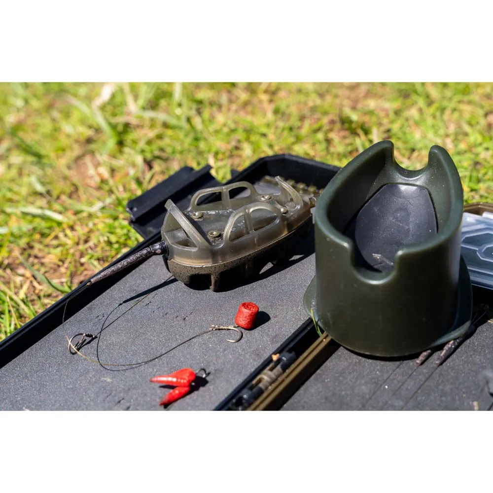 Il perfetto alimentatore per la pesca a lunga distanza con un volume aumentato di esche. Grazie al design unico con un lato realizzato con peso non tossico, l´alimentatore atterrerà sempre nella giusta posizione, presentando perfettamente il tuo collegamento e l´esca. Può essere utilizzato in combinazione con uno stampo Large Camo Method per un´applicazione raffinata delle esche. Può essere scambiato grazie al design del gambo interno.
