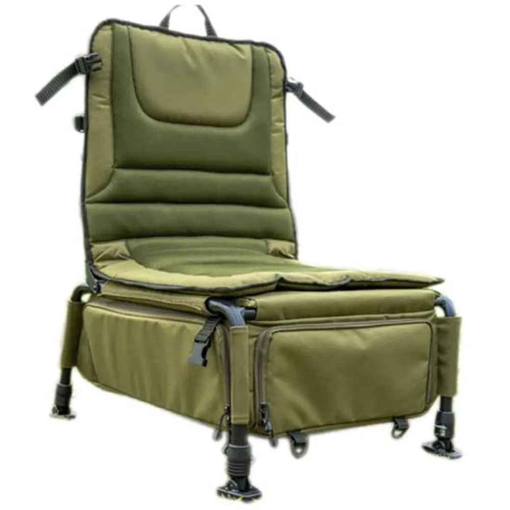 Una rivoluzione nel modo in cui i pescatori trasportano la loro attrezzatura da pesca. Combinando una sedia comoda e leggera con una borsa piatta e compatta, la Ruckchair può essere trasportata come uno zaino. Accedi alla tua attrezzatura da pesca direttamente sotto il sedile, proprio come fanno i pescatori sulle cassette porta attrezzi, senza problemi di peso e trasporto. La borsa presenta punti di accesso su tre lati e una tasca posteriore per picchetti e accessori per sedia. Si chiude con delle clip durante il trasporto. Gli spallacci dello zaino sono dotati di una tracolla regolabile in altezza. Presenta anelli a D aggiuntivi per il trasporto di materassini e retine. Dispone anche di una maniglia per il trasporto.