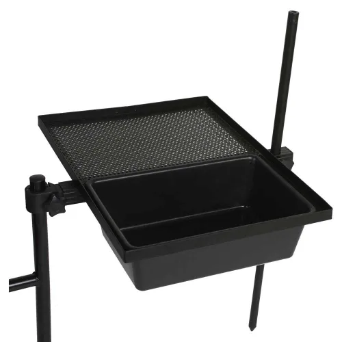 Tavolo con porta esche e porta esche, che può essere fissato alle gambe di una poltrona o di un paniere, utilizzando il supporto universale per gambe tonde da 36 o 25 mm. Cosa preziosa durante qualsiasi viaggio di pesca in cui sono in uso esche ed esche.