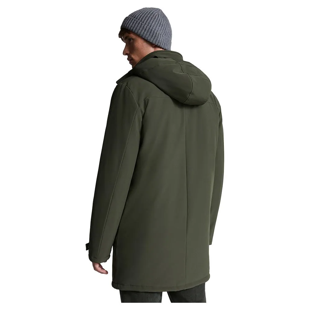 Il cappuccio, le tasche con patta e la chiusura coperta con zip a doppio cursore e bottoni a pressione sono dettagli funzionali.