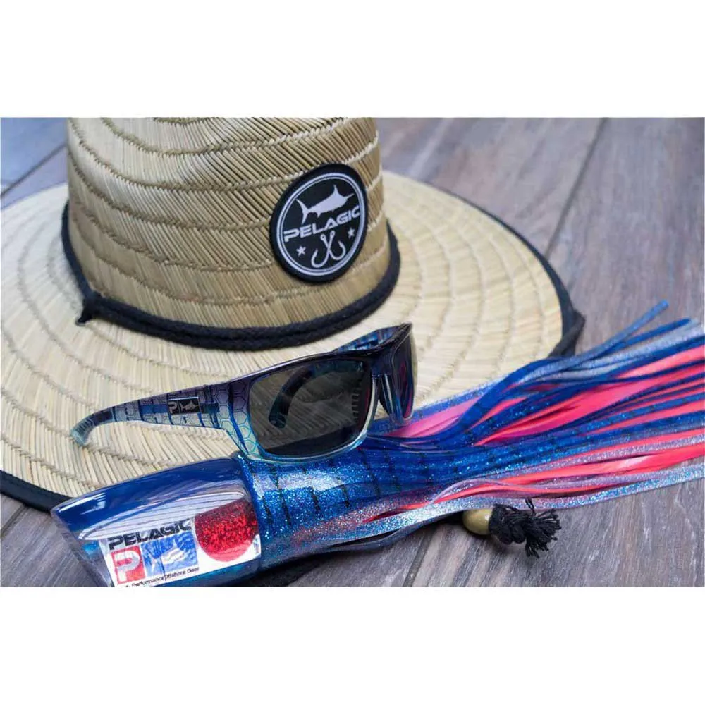 Fai un viaggio a sud del confine e goditi i raggi del sole con il cappello da pesca di paglia Baja! Questo cappello di protezione solare a tesa intera in stile bagnino in fibra naturale al 100% presenta una toppa frontale in gomma PVC con marlin e tonno con fascia elastica pelagica personalizzata all'interno del cappello.