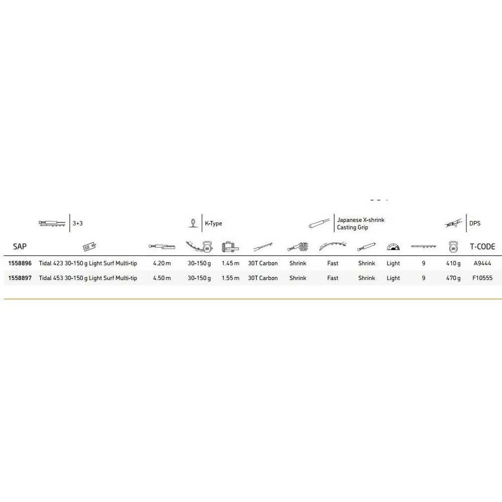 Le canne Penn Tidal Light Surf Multi Tip fanno parte del nuovo ed esclusivo concetto Penn Tidal Surfcasting. Questi Beach Ledgering sono lo strumento ideale per partite di pesca in spiaggia e condizioni calme con poca corrente. Combinano il surfcasting con la faretra da spiaggia. Il blank ultraleggero e sottile ha un'azione in bianco veloce, combinata con una punta in carbonio solido molto sensibile. Grazie alla potenza nella sezione centrale e di testa, queste canne hanno ancora molta potenza per lanciare molto lontano con pesi bassi. Viene fornito con 3 punte intercambiabili con la loro curva di prova unica.