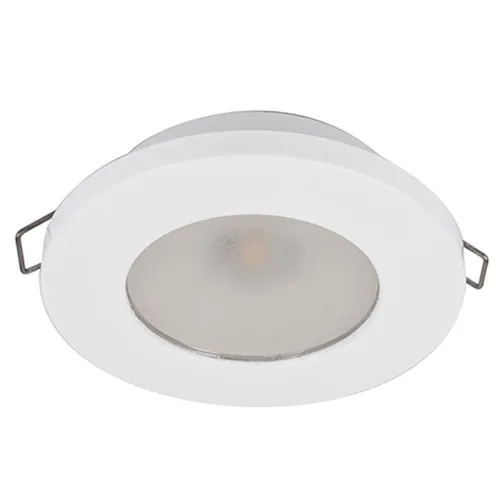 Downlight stagno IP40 con 2 LED ( 100 Lumen ) ad alta luminosità, luce bianco caldo, con cornice circolare, realizzato con materiale plastico RAL 9010, con diffusore in policarbonato satinato, ideale per installazione a soffitto e parete.
