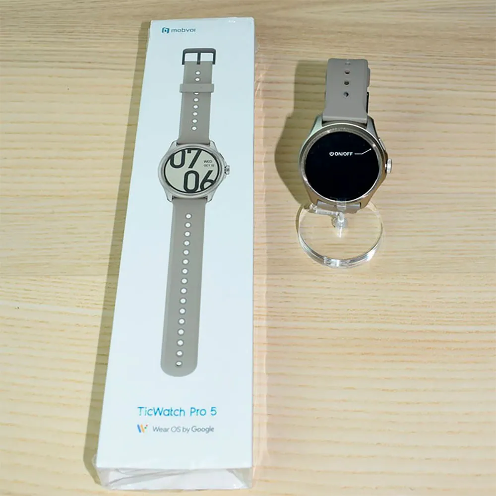 Presentazione del nuovo TicWatch Pro 5 sabbia, uno smartwatch di fascia alta che combina un design elegante e resistente con prestazioni eccezionali.