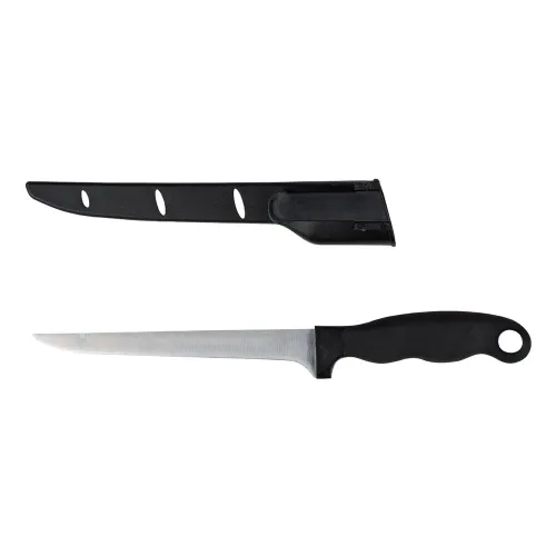 Het merk Arno biedt producten met een uitstekende prijs-kwaliteitverhouding. Dit mes uit de X-Blade serie, dat perfect is voor vissen of natuurlijk voor elk gebruik in de keuken, maakt ook deel uit van deze serie. Veel vissers willen na het vangen van de vis deze ook graag consumeren. De bereiding van vis is een belangrijk onderdeel van de verwerking. Door het mes goed te hanteren, kunnen er volledig graatloze stukken worden uitgehaald, waardoor het zelfs voor mensen die niet van vis houden aantrekkelijk is. Filets van goede kwaliteit maken het koken gemakkelijker en ze zijn aantrekkelijker in de bereidde gerechten. De lengte van het lemmet is 17 cm, wat geschikt is voor het bereiden van zelfs grotere brasem, meerval en graskarper. Het handvat is comfortabel, ergonomisch en, het belangrijkste, heeft een antislip oppervlak, zodat het ook met natte handen gemakkelijk te gebruiken is. Het mes is verkrijgbaar met een schede, die de snede beschermt en zorgt voor veilig transport. Het is een goed alternatief, dat u niet in de steek zal laten, zelfs niet bij gebruik in de keuken, tijdens het vissen of bij het maken van kleine visfilets voor aas.