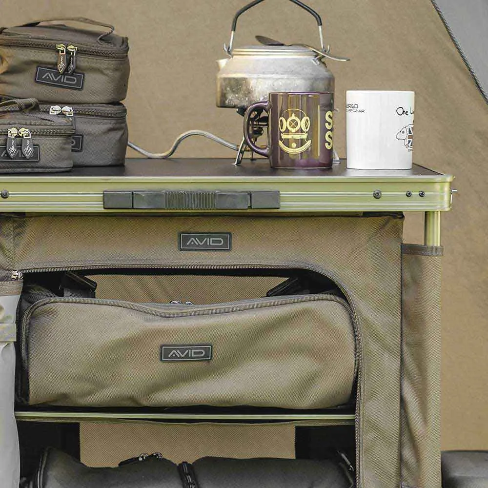 De Organizer heeft een lichtgewicht aluminium frame, harde planken, externe vakken aan elke kant voor extra opbergruimte, een gecoat tafelblad en onze waterdichte Dura Tech-stof.