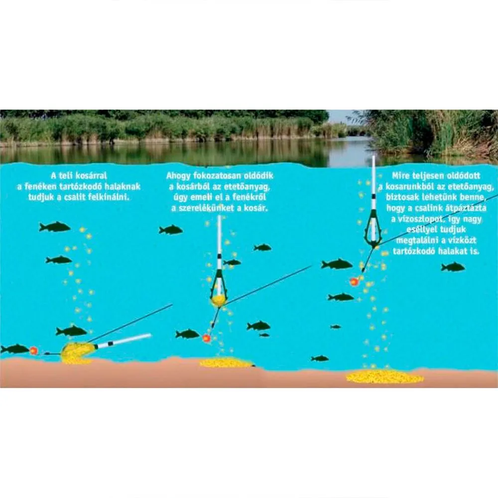 Terwijl hij zich naar het wateroppervlak beweegt, wekt hij de interesse van de vissen die in het water verblijven, en kunnen we intensieve spectaculaire beten verwachten van de vissen die het aas bederven. Als het water het oppervlak bereikt, verschijnt de steel van onze Pop Up feederkorf, waarna het de moeite waard is om even te wachten, zodat de vissen die op het oppervlak van het water verblijven en in warmer water een kans hebben om ons aas te krijgen. Met het juiste ritme van de worpen en het gebruik van goed kwaliteitsvoermateriaal kunnen we zeer succesvol vissen.