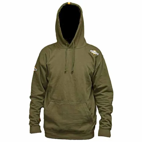 Hoody - kaki dubbellaagse capuchon, kangoeroezak en trekkoordhals met Dynamite oranje label op capuchon. Relaxte pasvorm.