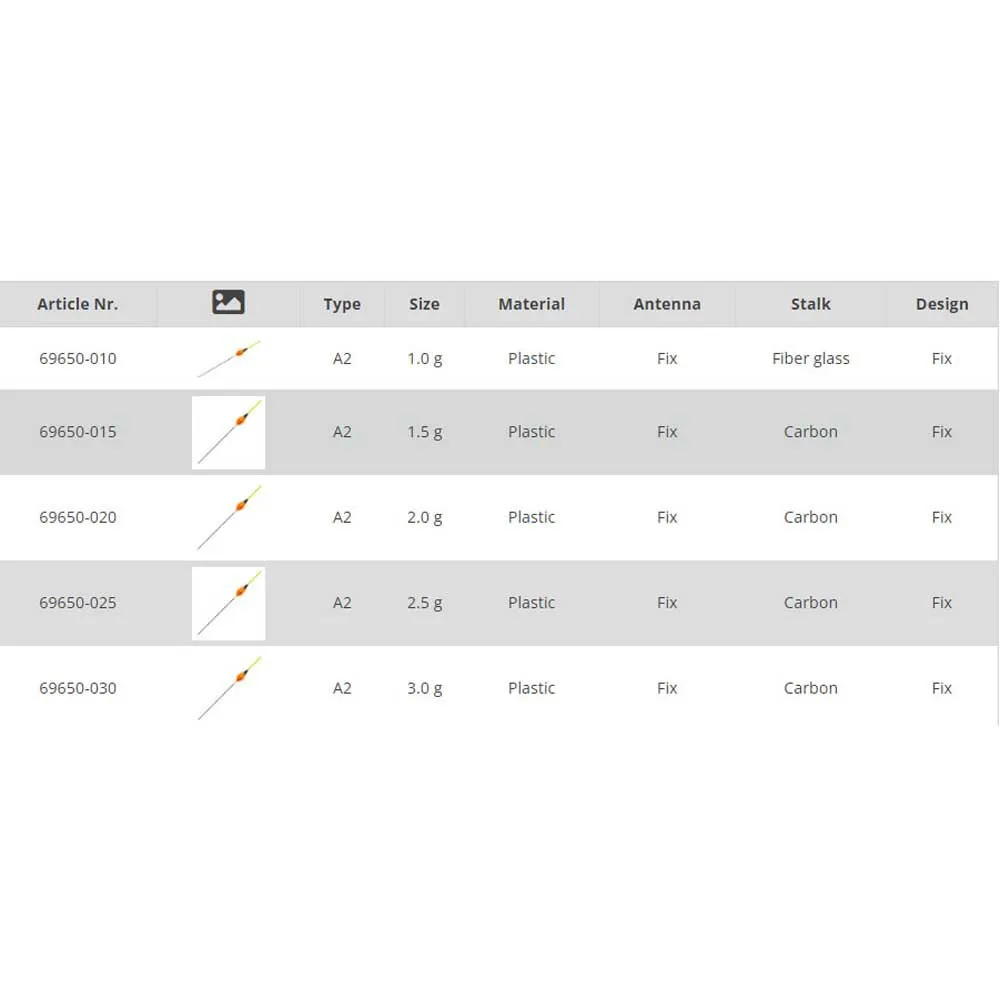 Energo Team A2 dobber De ET A2 is een drop dobber met een minimaal langwerpige vorm. De antenne van het product heeft een vaste, goed zichtbare gele kleur gekregen. De steel is gemaakt van glasvezel en heeft een grootte van 1 tot 3 gram. Vaste versie, er is een lipje aan de zijkant en voor de onderste steel wordt het aanbevolen om een ​​eenpuntsdobberbevestiging of een siliconenbuis te gebruiken. Een ideale keuze voor een hengel. De kleinere maten zijn geschikt voor brasem en de grotere maten zijn zelfs geschikt voor karpervissen.