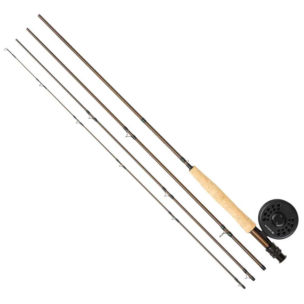 Een hoge kwaliteit medium fast action hengel en aluminium vlieghaspel voorzien van WF drijvende vlieglijn en onderlijn geleverd in een handig reisetui.