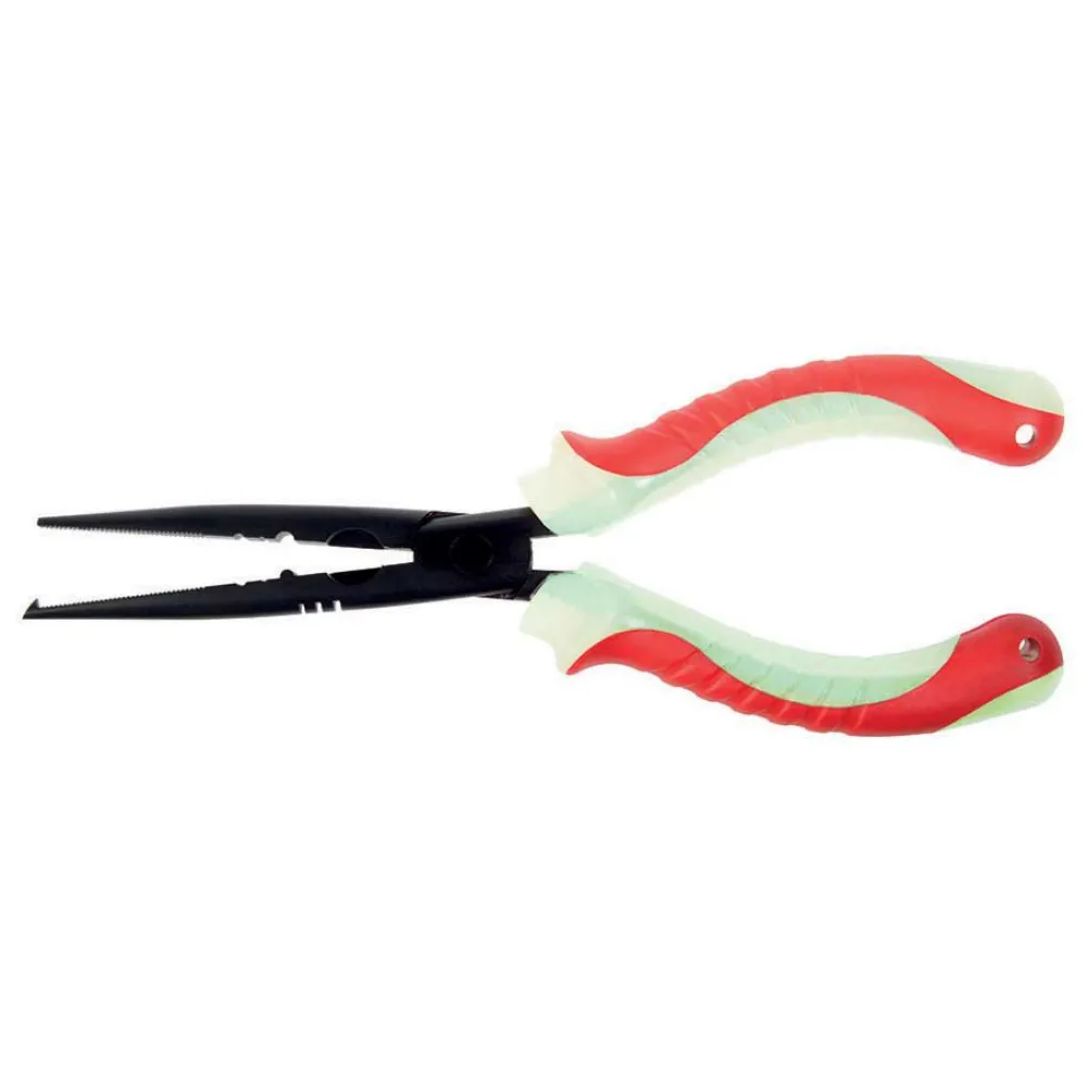 Kenmerken: Snijranden voor gevlochten lijn, monofilament en fluorocarbon; Krimptang; Splitringopener; Haakverwijderaar; Gekartelde bekken; Ergonomische antislip handgrepen; Veerbelast ontwerp; Bevestigingspunt voor lanyard.
