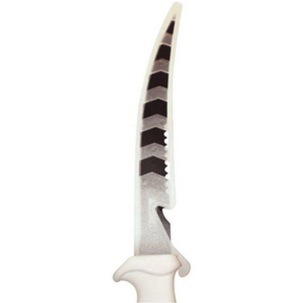 De messen taps vlijmscherp lemmet is gemaakt van de Duitse roestvrij staal, en is toch stevig flexibel genoeg voor delicate werk. Het blad is voorzien van een gekartelde top voor de schaalvergroting en een lijnsnijder die toegankelijk is, zelfs wanneer het mes in de schede.
