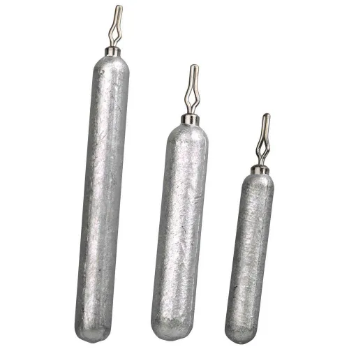Potloodvormige dropshotgewichten met een speciale clip die een knooploze verbinding mogelijk maakt.