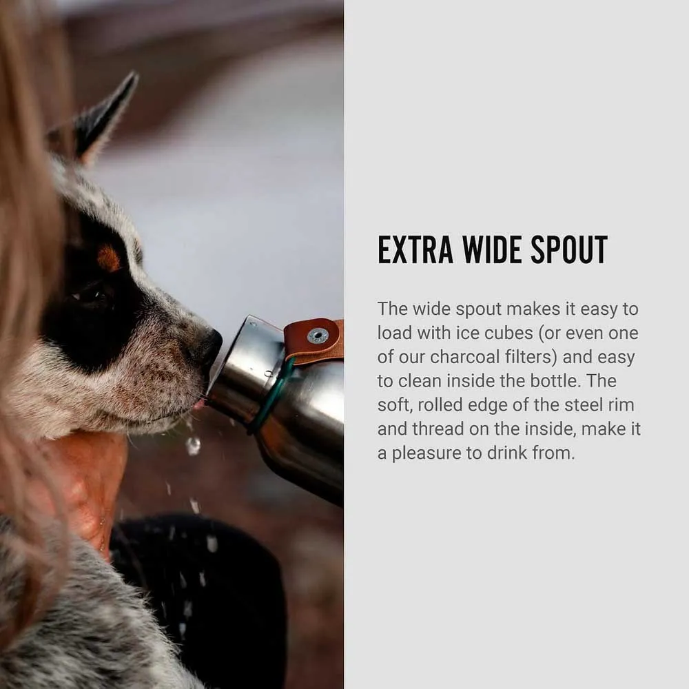 - Tuten er ekstra bred, noe som gjør det mye enklere å legge til isbiter eller et kullfilter i flasken. Det sikrer også enkel rengjøring. Stålringen har innvendige gjenger for en optimal drikkeopplevelse.