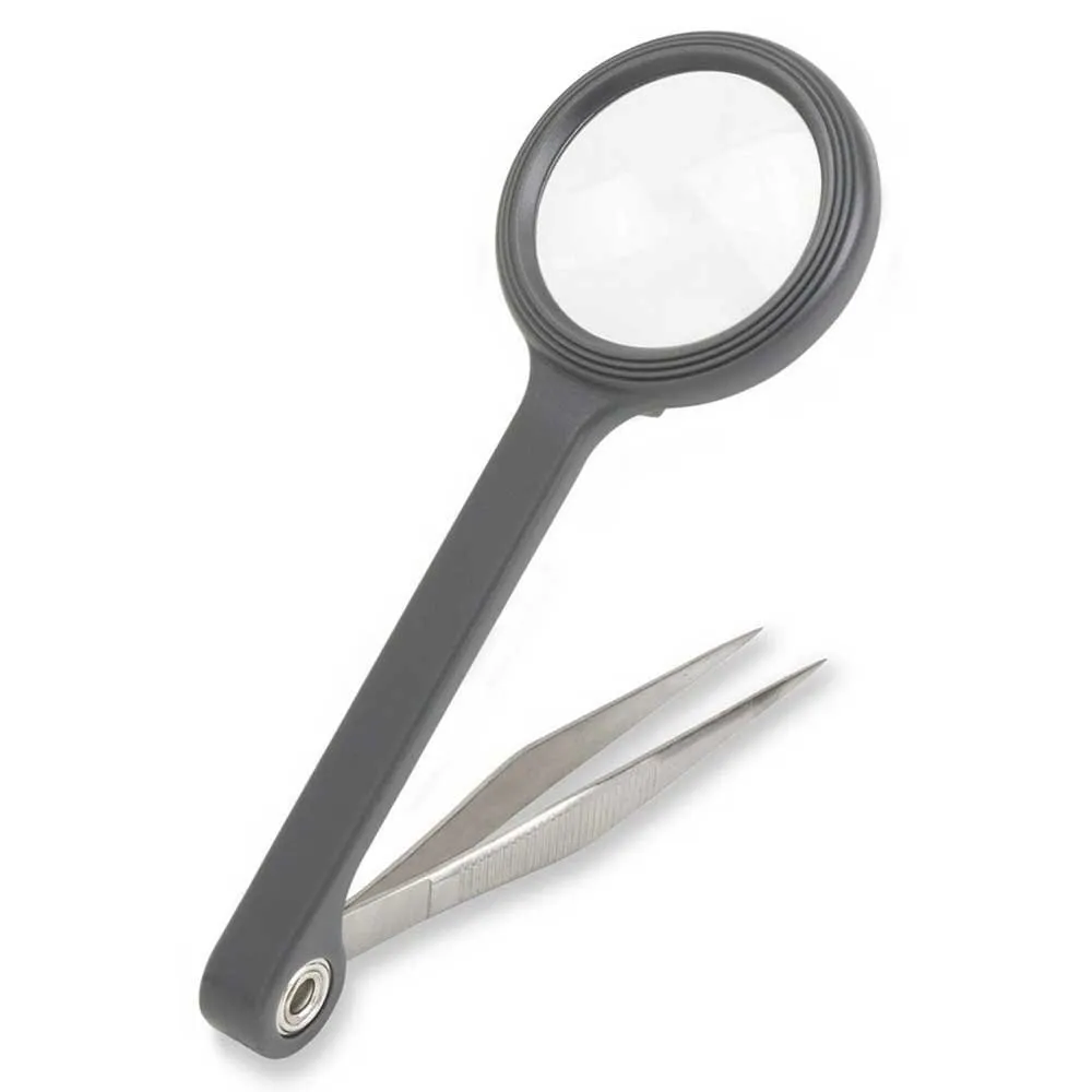 Forstørrelsesglass med pinsett inkludert, ideell for å binde fluer.
