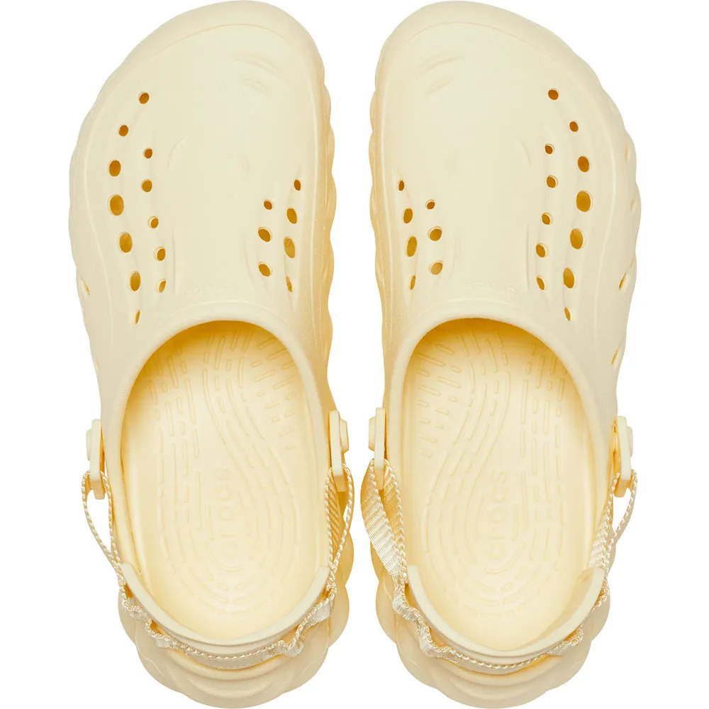 Opplev den neste dimensjonen av stil med CROCS Echo Clog. Denne treskoen kombinerer dristig, streetwear-inspirert design med uovertruffen komfort, og er for den moderne trendsetteren. Dens støtte med dobbel tetthet har en lett Croslite™-base og en revolusjonerende LiteRide™-innleggssåle for en følelse av å synke ned i mykhet. Avanserte ventilasjonshull holder deg avkjølt, mens den svingbare Turbo-hælremmen gir en sikker, justerbar passform. Lett, vannvennlig og klar for alt, er Echo Clog komfort som gjør et inntrykk