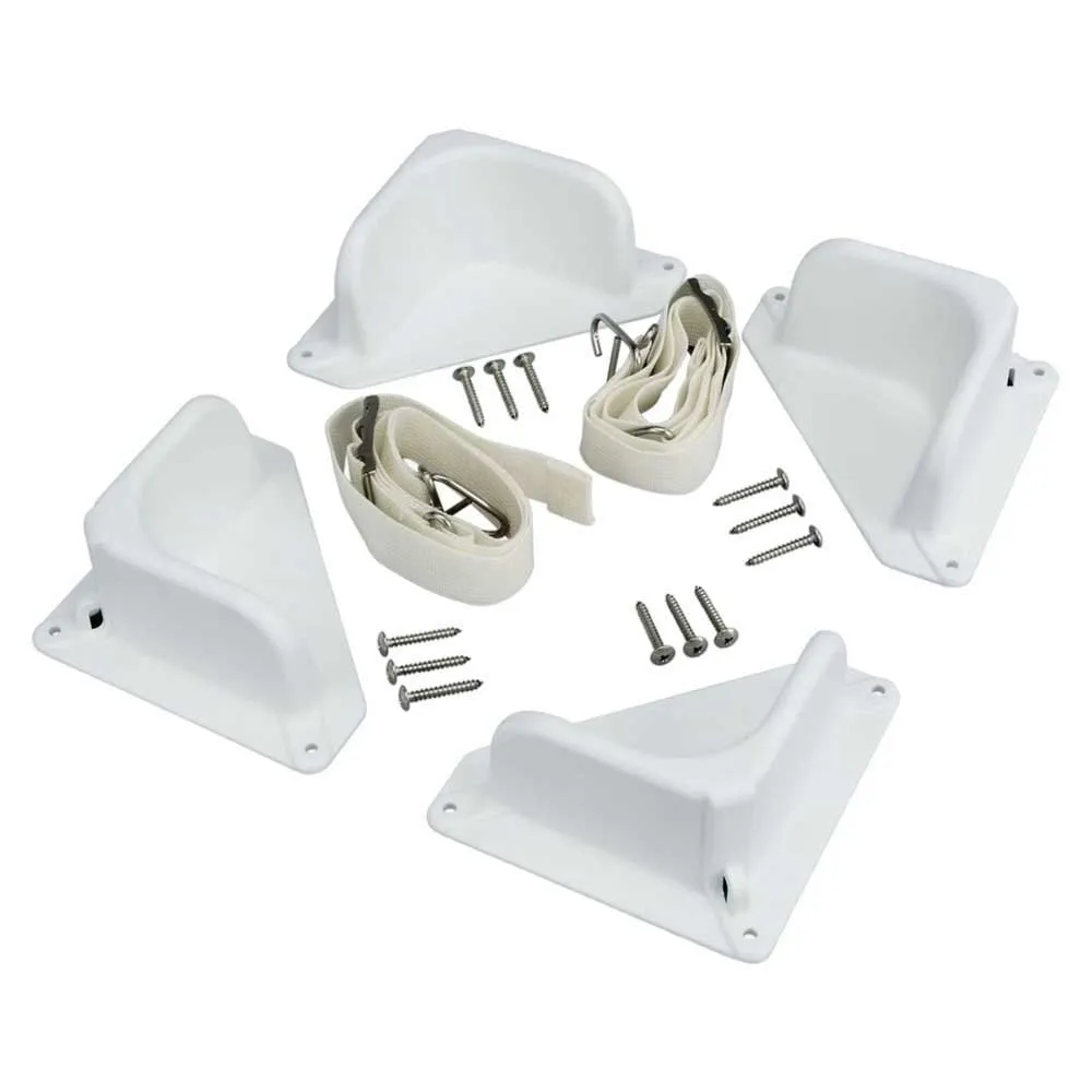 - Inkluderer: 4 nedre hjørnebraketter, 2 stropper, 12 skruer, instruksjoner