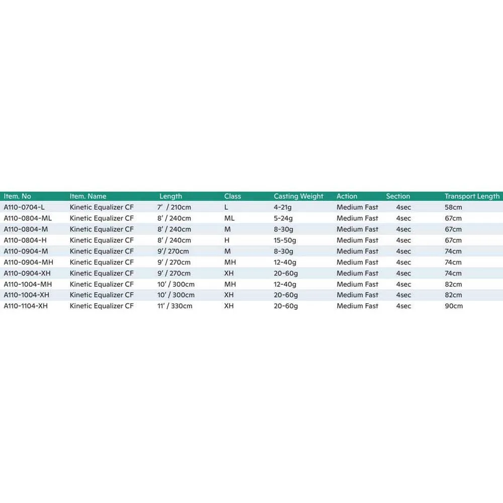 KINETIC Equalizer CF Spinning Rod er en fin stang som takler vann med jevne sterke strømmer med opptil 60 g bly eller blits. Med en lengde på 3,30 kastet den også langt. Det er en firedelt stang, likevel er den passe stiv til de fleste oppgaver ved kysten og bryggen.