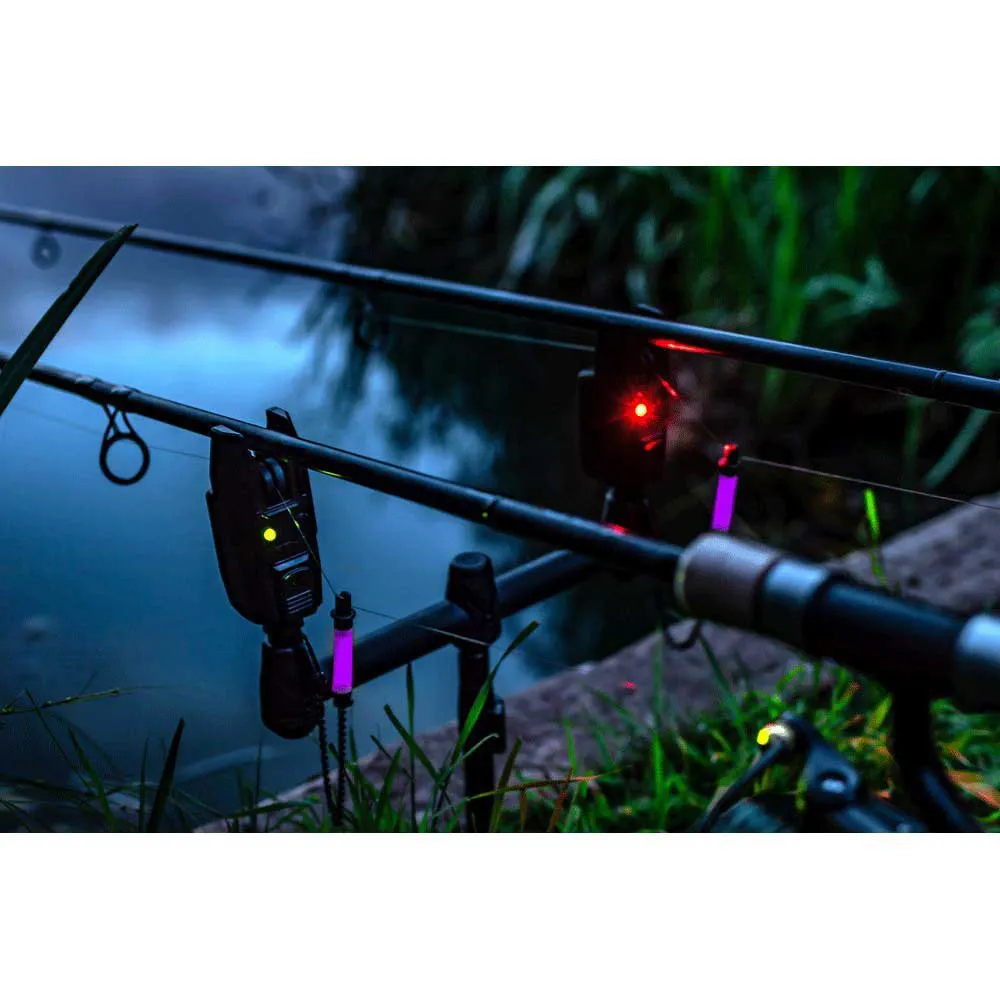 Dette alarmpresentasjonssettet inneholder to eksterne alarmer og en trådløs bite alarm -mottaker, pluss to lyse lilla biteindikatorer.