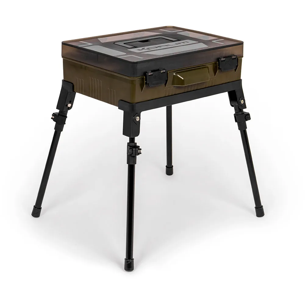 En frittstående komplett tackle-stasjon! Din perfekte følgesvenn ved elvebredden, som holder alt av terminal tackle, verktøy og rigger i én super solid tackleboks-enhet. Vi har nøye dimensjonert BLOX for å romme nødvendige ting for end tackle, som spoler med snøre, pakker med kroker og tilbehør. Dine agningsverktøy, krokløsner og saks klikker alle pent på plass, mens hovedboksen kan justeres med skillevegger for å passe dine behov. Lokket inneholder også to grunne RIG BLOX inni, som holder alle dine ferdigknytte fortommer trygge fra elementene. Leveres med teleskopiske ben, som gjør at du kan ha enheten innen rekkevidde når du fisker fra en stol, eller holder deg superorganisert når du fisker fra et ly. Leveres med et slitesterkt, fastmontert bærehåndtak, sidehåndtak, sikre klips og pakning. Inkludert er også en lengdemåling for å knyte rigger.