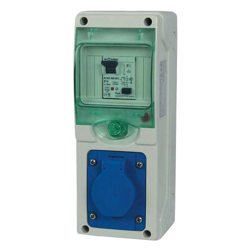 Kystsoneforbindelseenhet for overføring av hovedstrøm Ac 230v/50Hz med Schuko-uttak. Hovedstrømkontrollampen viser hovedstrømmens status. Intern hovedstrømforbindelse direkte til RCBO-sikringsbryterens terminaler, kabelinngang med kabelgjenger.