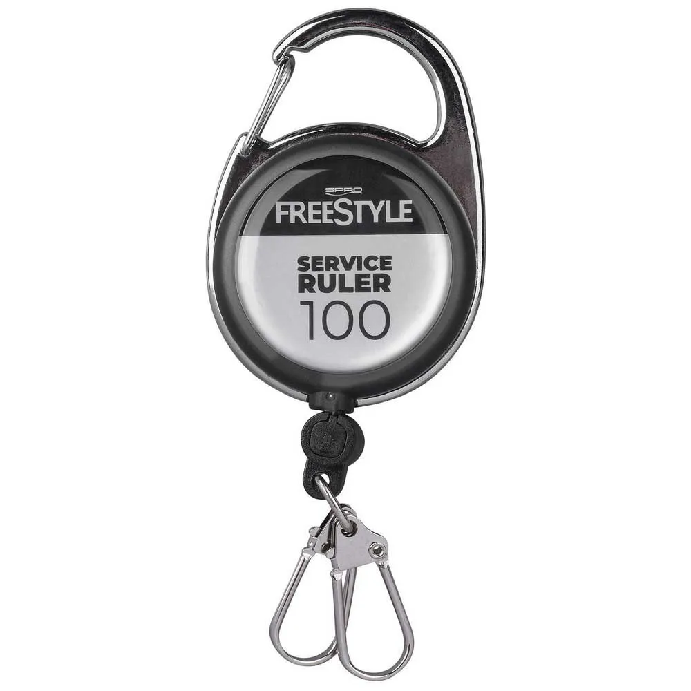 Servicelinjalen er et hendig verktøy for å koble til din Freestyle foldetang eller annet tilbehør. Det automatiske viklingssystemet kan trekkes ut opptil 100 cm under bruk. Forbindelsen mellom produktet og karabinkroken er en 100 cm linjal for å måle fangsten om nødvendig.