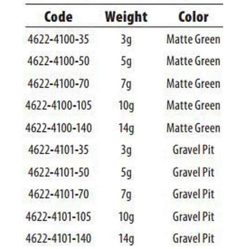 High End Tungsten bullet sinkers i kamuflasjefarger. Matte Green gir maksimal usynlighet på en mørk bunn og mellom blåskjell. Grusgrav er det perfekte valget på en lys bunn, som ligger i de fleste elver, innsjøer og grusgraver. Wolfram er kompakt, tung og superhard, noe som gir deg god følelse og "tilbakemelding" under fiske.